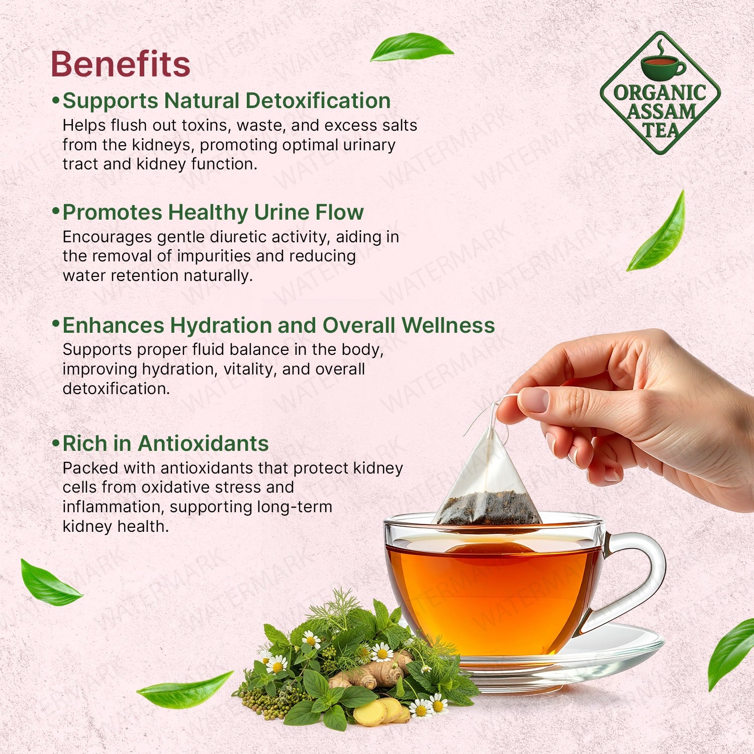 Kidney Cleanse Tea is a gentle herbal wellness blend formulated to support kidney detoxification, urinary tract health, and fluid balance. Crafted with premium Assam tea leaves and traditional cleansing herbs, this tea helps flush toxins, reduce water retention, and promote overall kidney comfort—naturally and safely for daily wellness.
